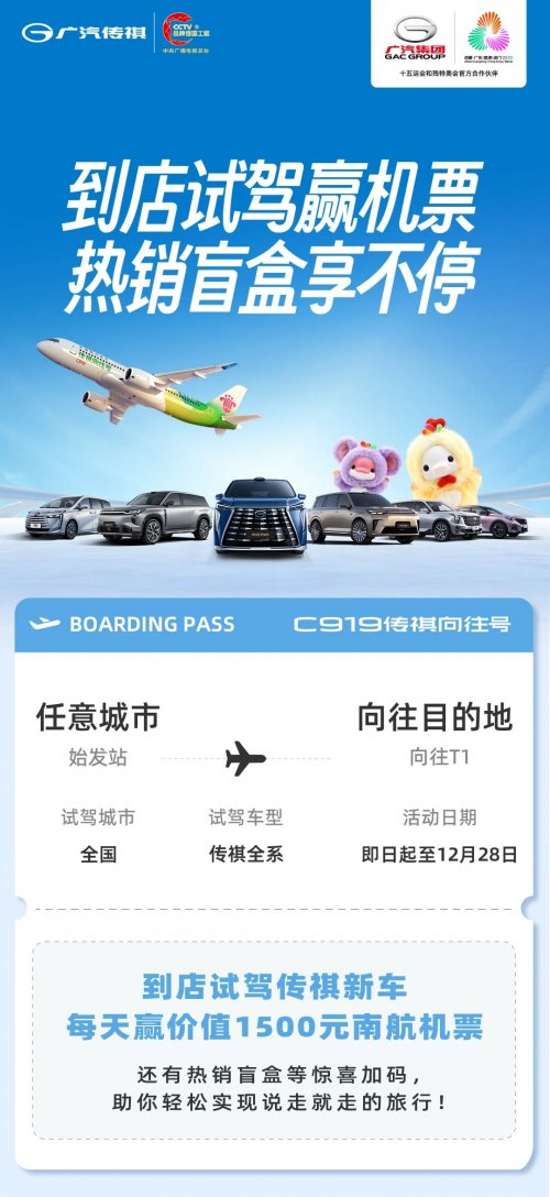 为兑现美好生活想象,传祺向往构建了覆盖“吃穿住行用学娱”的用户共创权益体系——“向往的生活圈”,宛如一位贴心的“假期生活管家”。热门喜剧演出、景区家庭套票、例外服饰高等级会员、顶级赛事观赛门票等福利持续上线,更有试驾专属惊喜——完成传祺活动车型试驾,即可免费获取“大湾鸡”生肖盲盒,12月28日前还能加码参与价值1500元的南航机票抽奖!