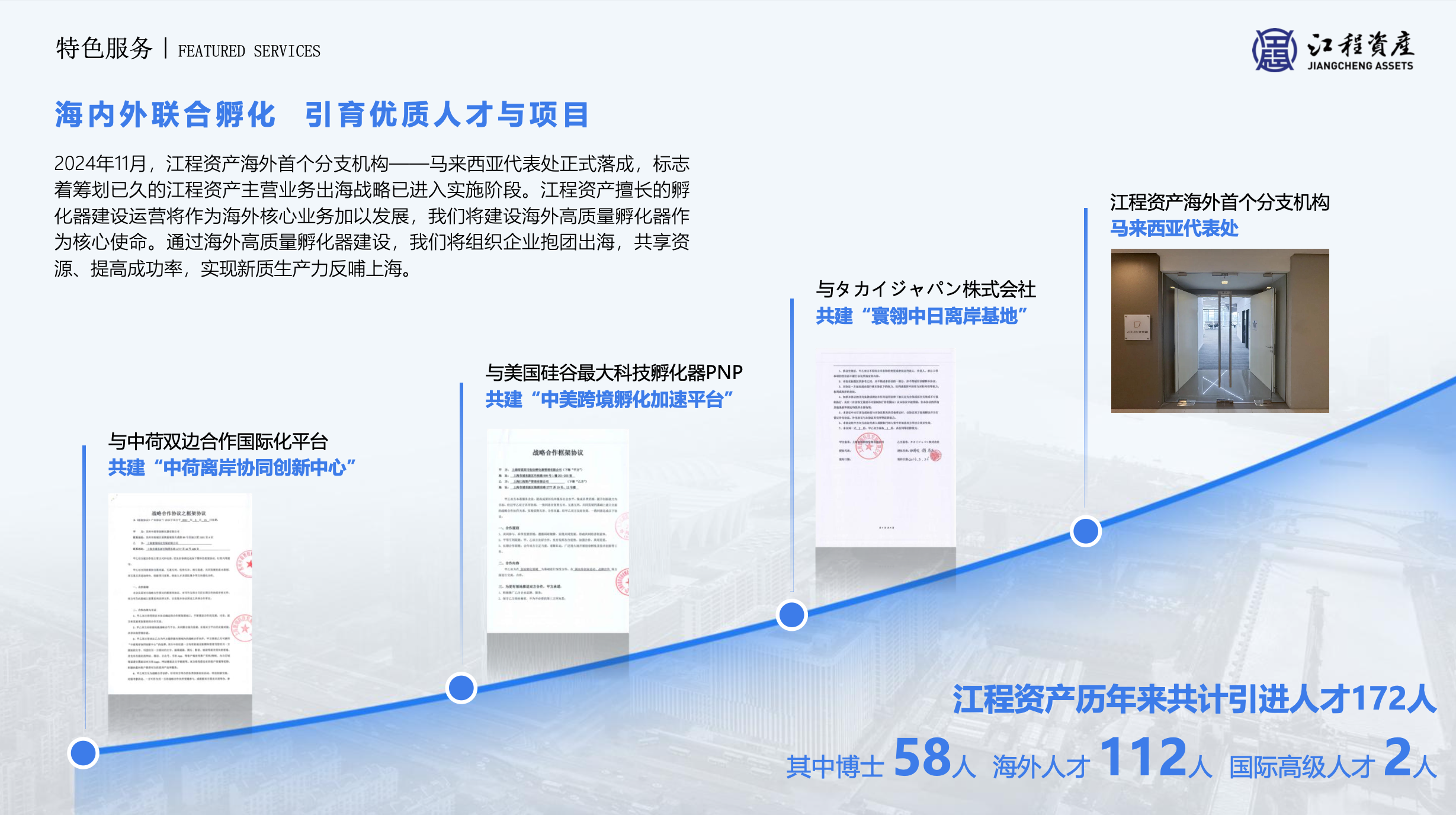 目前,江程资产已在新加坡JHub@20 Anson、马来西亚等地建设本地化创新社区,并与中荷、美、日等多国机构共建跨境协作平台,包括“中荷离岸协同创新中心”“中美跨境孵化加速平台”“寰翎中日离岸基地”等,初步形成覆盖亚太、连接欧美的国际化服务网络。