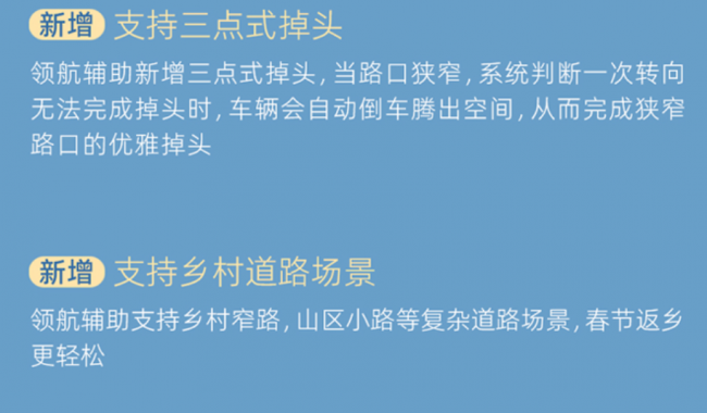 针对春节返乡途中常见的乡道窄巷、山区弯路等复杂场景,新增“乡村道路识别能力”,可精准感知非城市道路特征,提供稳定、安心的辅助驾驶体验。