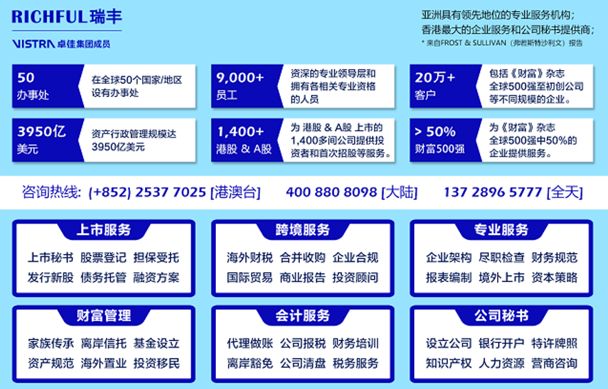 RICHFUL瑞丰系Vistra卓佳集团成员公司。作为领先的企业和私募基金客户关键业务专业服务机构,Vistra卓佳在全球50多个国家/地区设有办事处,拥有9000多名员工,服务实体超过20万家,资产行政管理规模达3950亿美元。客户包括1400家港股上市公司,50%名列《财富》杂志的500强企业及66% PEI 300全球领先私募股权投资机构。