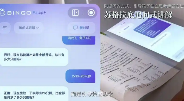 只需一声“宾果,宾果”,苏格拉底大模型与多模态AI系统即刻唤醒。无论是“星星为什么眨眼”的天文奥秘,还是课本之外“十万个为什么”,它都能以孩子能理解的语言,深入浅出地给出解答与拓展。在作业辅导上,其搭载的“三师会诊”模式(晓晨、明睿、渊博三位AI老师)能针对不同题型提供追问式讲解,如同身边随时在线的顶级家教团队,引导孩子举一反三,变“单向输入”为“双向共创”的探索对话。当好奇心和求知欲被高效满足,学习的兴趣与成就感也随之高涨。