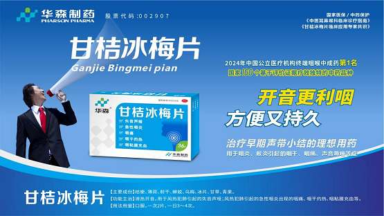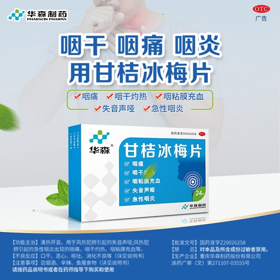 华森制药甘桔冰梅片是2002年批准上市的创新药,国家医保品种,国家中药保护品种。其处方由《政治准绳·类方》卷二中的经典名方清音丸加减化裁而来,“咽-喉同治”,填补了基药目录中无“清热开音”类及“咽-喉同治”中成药的空白。该药是临床治疗急性咽炎、急性喉炎等的一线用药,米内网数据显示其市场占有率位列全国等级医院及基层医院终端咽喉中成药第1名。入选首批《100个基于评价证据疗效独特的中药品种》,并获十余项指南/专家共识推荐。疗效确切,安全性好,日治疗费用(5.06元)处于咽喉类中成药低位水平,药物经济学评价显示其与清咽滴丸比较,治疗急性咽炎成本更低,疗效更好,是一种绝对优势方案。