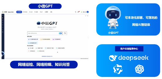 作为信锐重磅推出的“网络AI数字专家”,小信GPT是基于A5i架构延伸的本地化网络AI智能体,通过“NMC交互组件与网络AI智能体服务组件分离”的核心设计,结合TCL用户智算中心(如DeepSeek模型),实现在网络巡检、故障定位、知识问答等三大运维场景、五十余子场景维度的自然语言交互式运维。