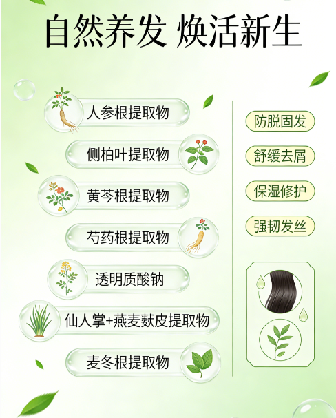 优势:天然草本成分,温和滋养不刺激,兼顾头皮健康与发根活力,适配全年龄段,不加重出油负担。