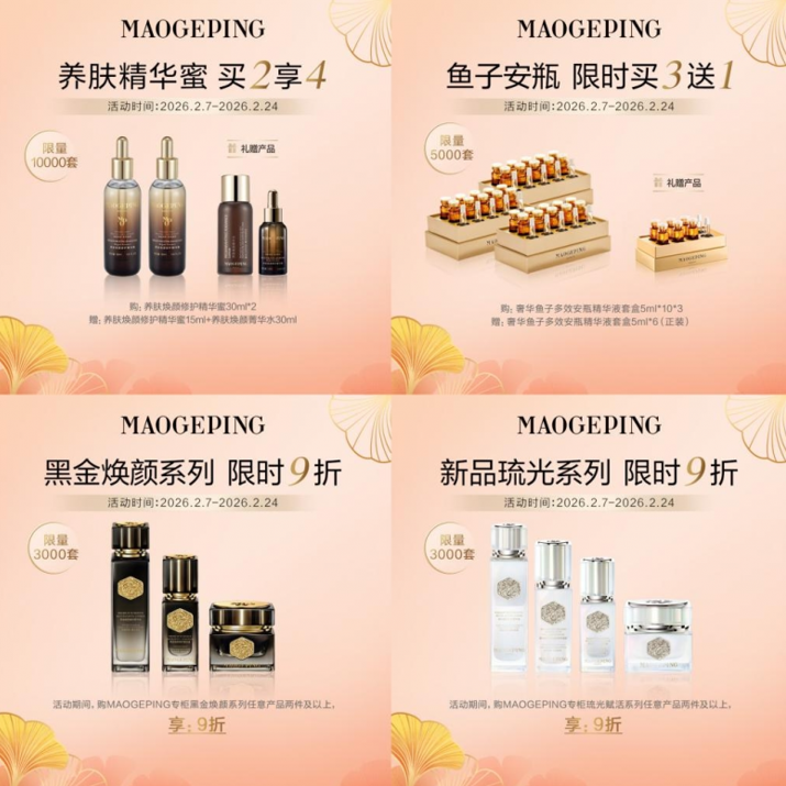 此外,活动期间,购MAOGEPING专柜黑金焕颜系列/琉光赋活系列任意产品两件及以上,享9折优惠,以高效仪式开启崭新一年的肌肤状态。