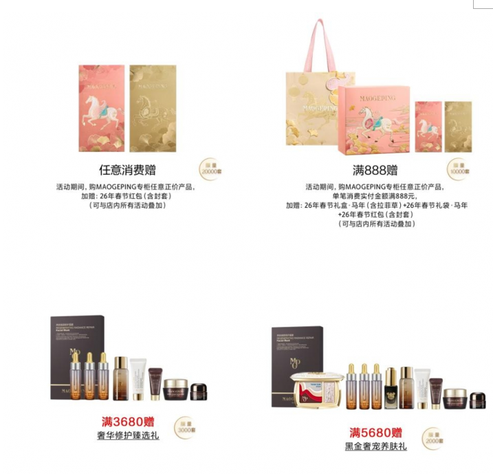 购MAOGEPING专柜任意正价产品,加赠马年春节红包(含封套);满888元,加赠“春节礼盒礼袋+春节红包”(可与店内所有活动叠加)。